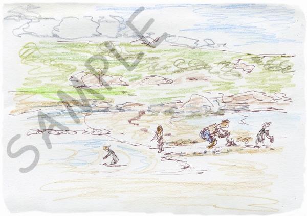 Notes: | Quick sketch of Jon and children damming the burn in July 2025. For once the children hadn't wandered off to do something else. Another addition for my "What we did on the beach" book I've not finished this, was intending to add more watercolour, but broke my wrist. A more finished version will probably be added later |