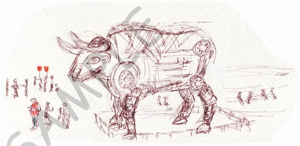 Notes: | Sketch of Ozzie the bull in Grand Central station, from the juice bar on the first floor, done on a sketching day with Hall Green Art Society. I did a series of sketches of the bull and the pedestrians - only realised later that the group with the red balloons was my cousin and her grandchildren |