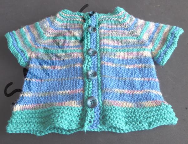 | Notes: | Cardigan knitted from an online "knit-a-long" pattern. I wanted some simple knitting to do on a long car journey, so I offered to make something for my grandson. This was using up some yarns I inherited from my mother - mostly soft cottons, and is a simple top-down raglan, which can be adjusted to length if required. Not for sale of course |