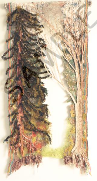 | Notes: | Inspired by winter walks in woods/forestry areas. Designed to hang in front of a long mirror in our bathroom. Background woven on a scarf loom, using a specially dyed warp and a variety of wefts, then felted and machine embroidered. Foreground trees woven on an inkle loom, using a variety of yarns from stash, manipulated by reducing the warps and braiding/twisting spare warp ends, adding in extra yarns where needed. Roots finished by braiding using bobbin lace techniques |