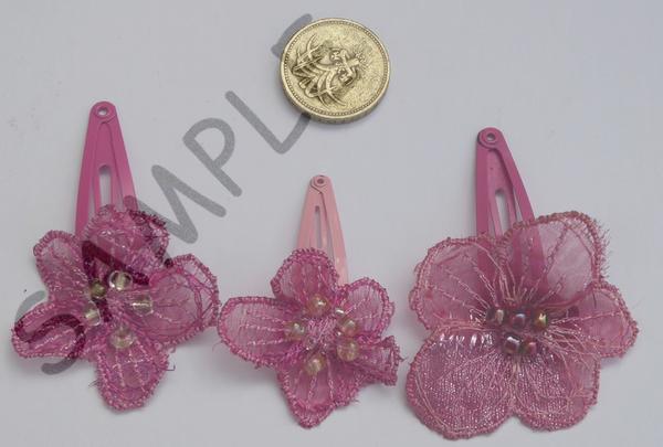 Notes: Machine embroidered flowers on clips. The two outside were commissioned, but the middle one is still in my stock at the moment, and I can always do more similar ones