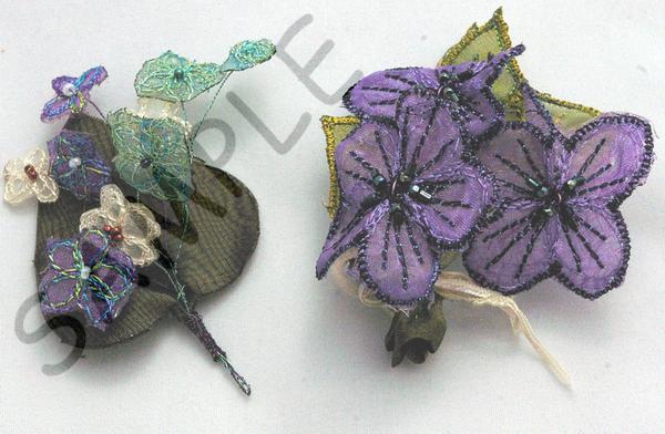 | Notes: | Machine embroidered, wired and beaded flowers collected together into a posy and mounted with a brooch or safety pin back. The sort of thing that could have been worn to show support for the suffragettes - but now would be good as a wedding corsage. |