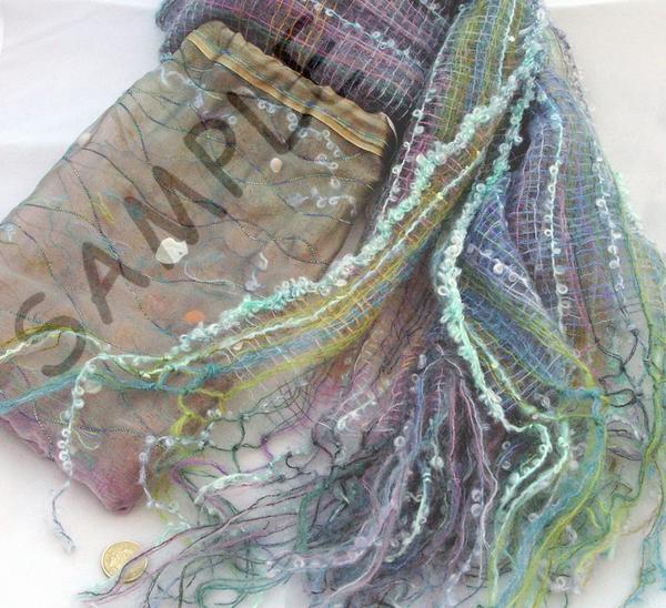 | Notes: | The new shawl for the blue-green sea and sky collection. This one is slightly greener than the original, and has some wavy lines rather than all the lengthwise wefts going the full length of the shawl. Some of the same Kaffe Fassett designed yarns, and some others and novelty yarns. Again it comes with a double organza bag with trapped real shells and yarn scraps |